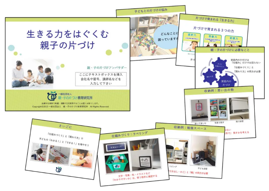『親・子の片づけインストラクター2級認定講座』をご受講された片づけのプロの方は、ファミ片のエッセンスがギュッと詰まった スライドのセットをご購入いただけます。講演会やセミナーで使用できる内容です。